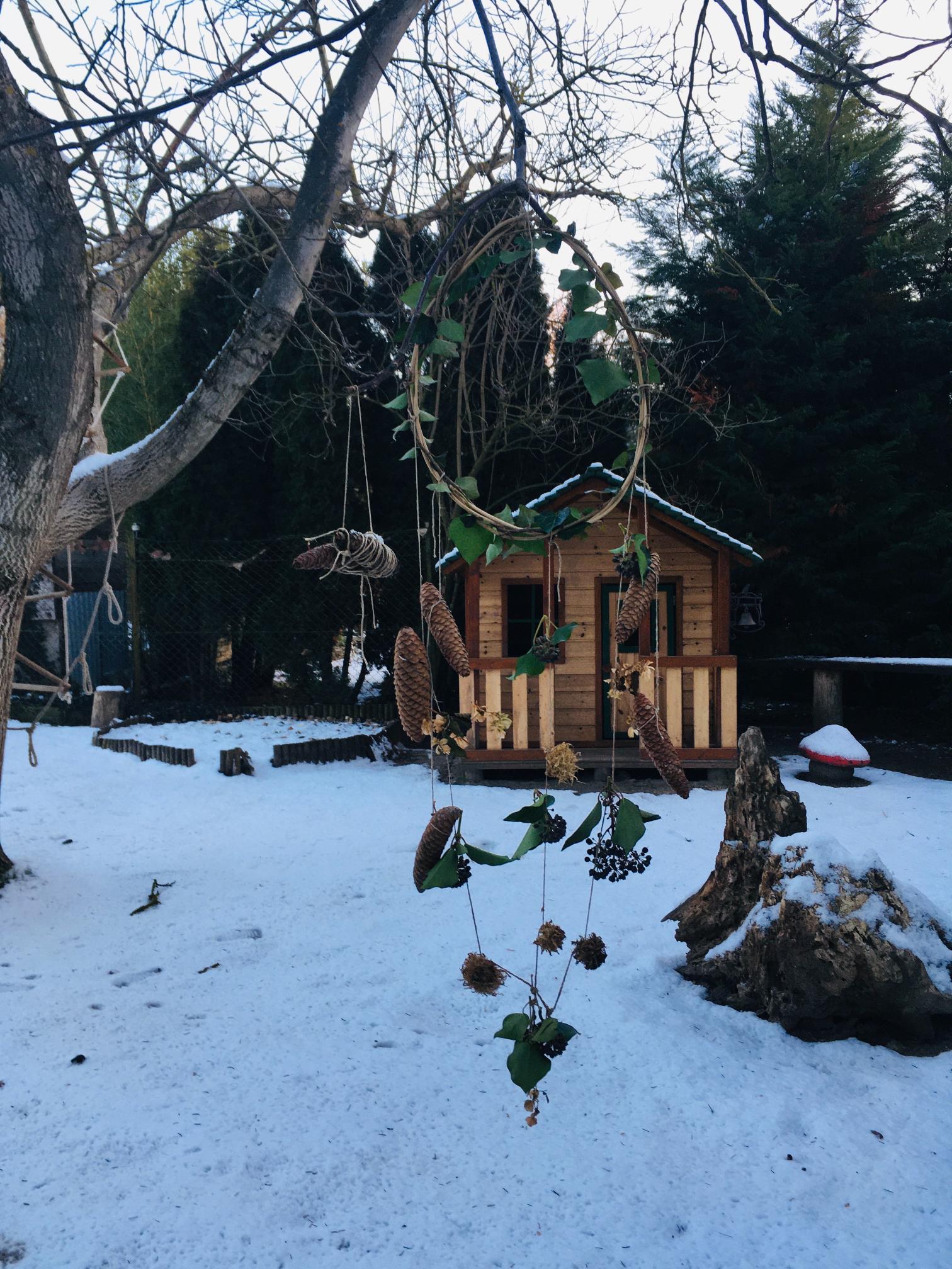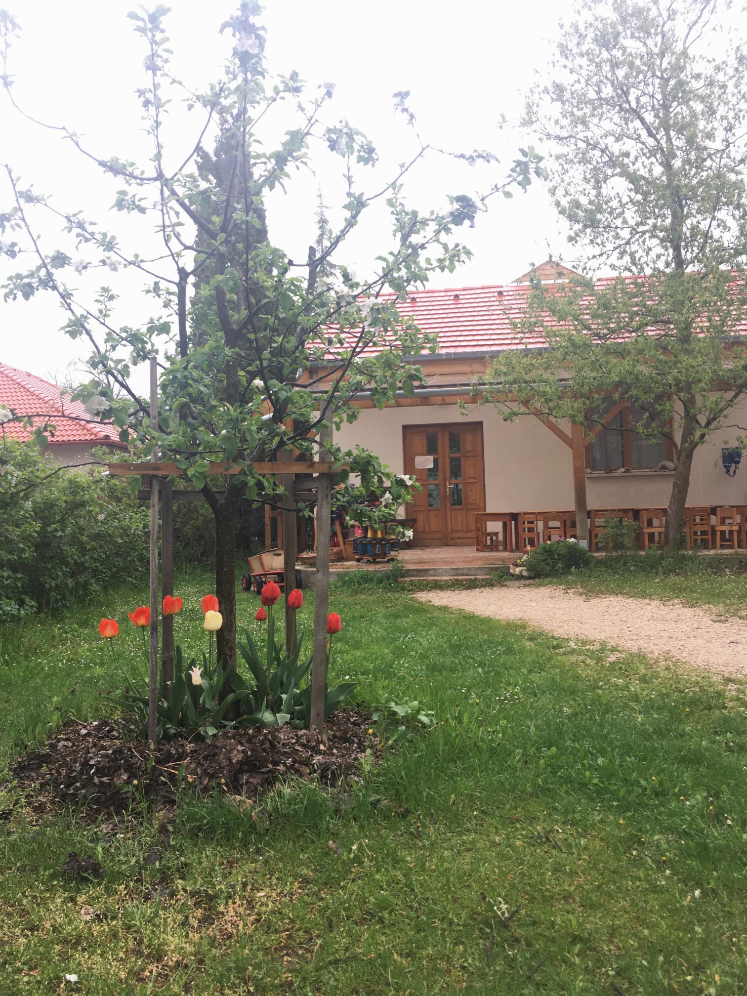Ezt követően a gyerekek az udvarra mennek, ahol másfél órát töltenek friss levegőn, akár esős időben is. Az udvar nyugodt, zárt környezete ideális a gyerekek mozgásának, felfedezésének és fantáziájának kibontakoztatására. A kertben homokozó, faház, kötél mászókákat is találni, de vannak szerszámok és felnőtt munkaeszközök kicsinyített másai is (pl.: talicska, lapát, seprű, gereblye, kalapács.)