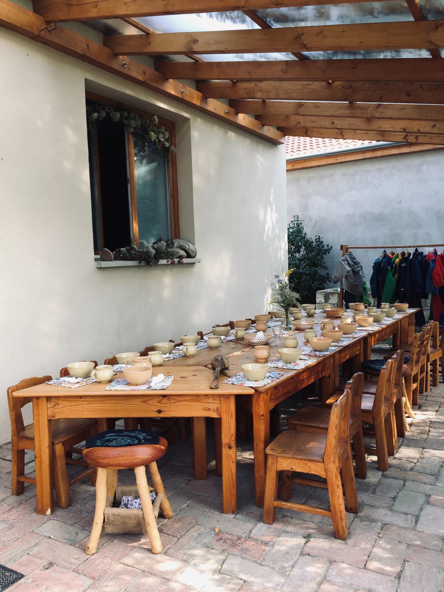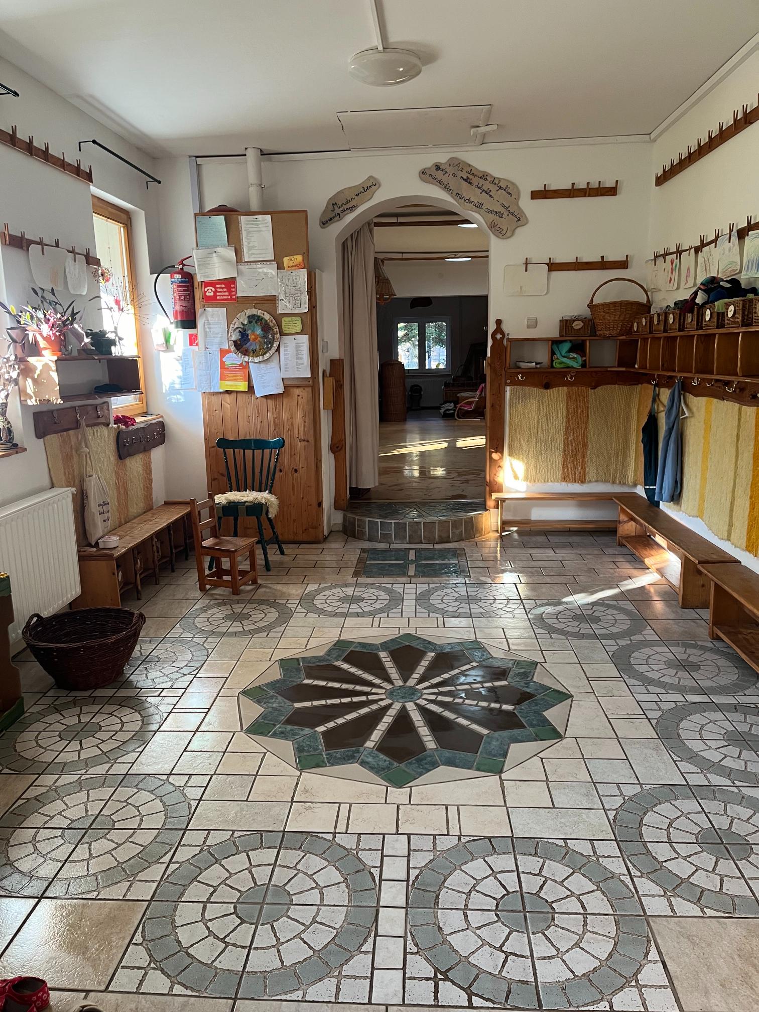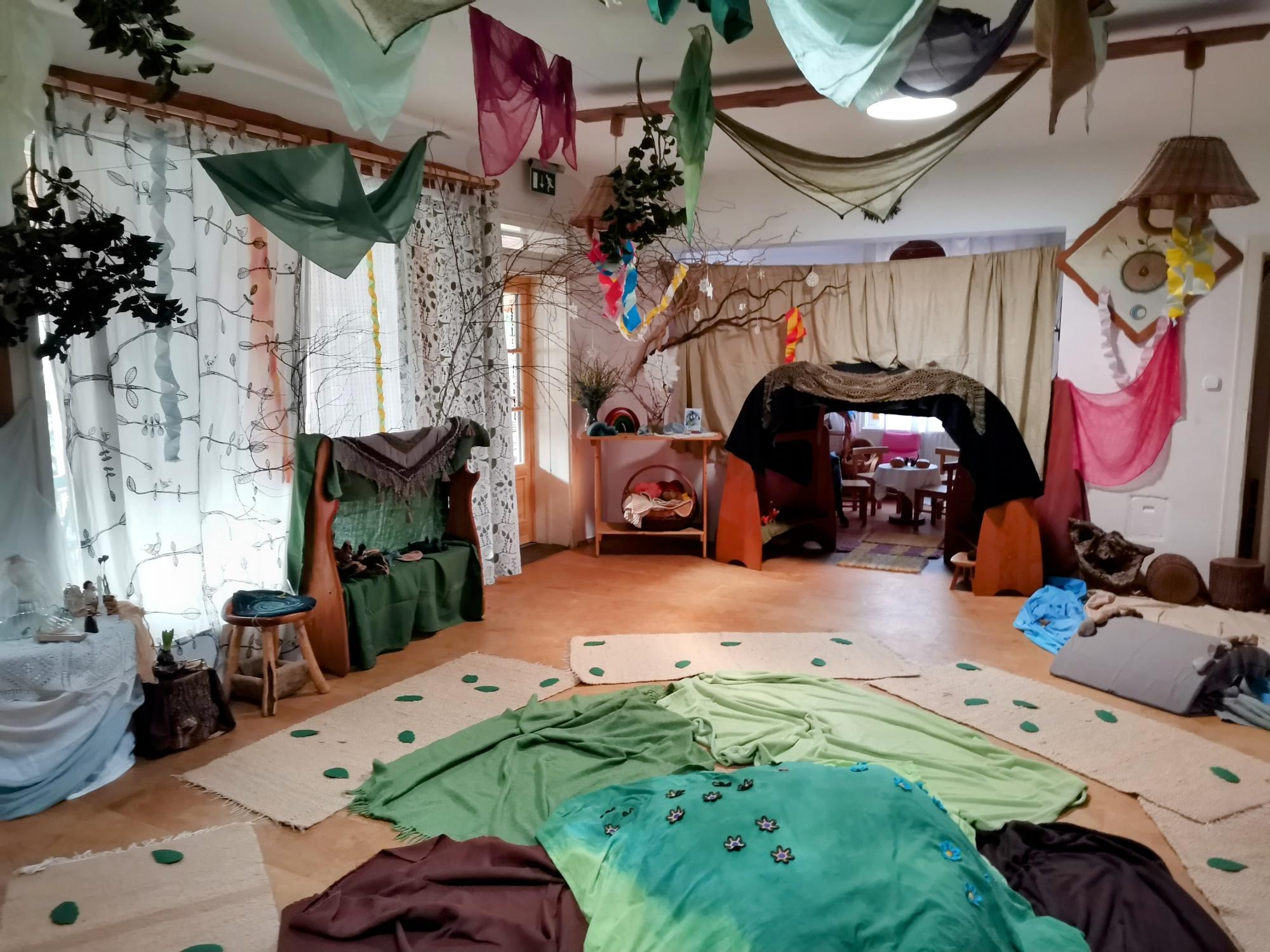 Az ebéd levesből és az óvónők által, frissen készített az adott nap gabonájához igazított húsmentes egytálételből áll. Étkezéseink az egészséges táplálkozást helyezik előtérbe, és külön figyelmet fordítunk az ételallergiás gyermekek szükségleteire is. Ebéd után a meseszobában elhúzzuk a függönyöket, és a gyerekek csendes, nyugodt légkörben meghallgatnak egy ünnepkörhöz kapcsolódó mesét. 12:30-re jönnek a szülők a gyerekekért, a bent alvó gyermeket 15:30-kor viszik haza szüleik. A pénteki nap eltér a többi hétköznaptól, ilyenkor a közeli erdőben kirándulunk, ahol a gyerekek szabadon játszhatnak. Ezen a napon óvodánk 12:30-kor zárja kapuit. Óvodánkat a természetes ritmus, az alkotás és a közösségi élmények harmóniája határoz meg, biztosítva a gyermekek kiegyensúlyozott fejlődését.